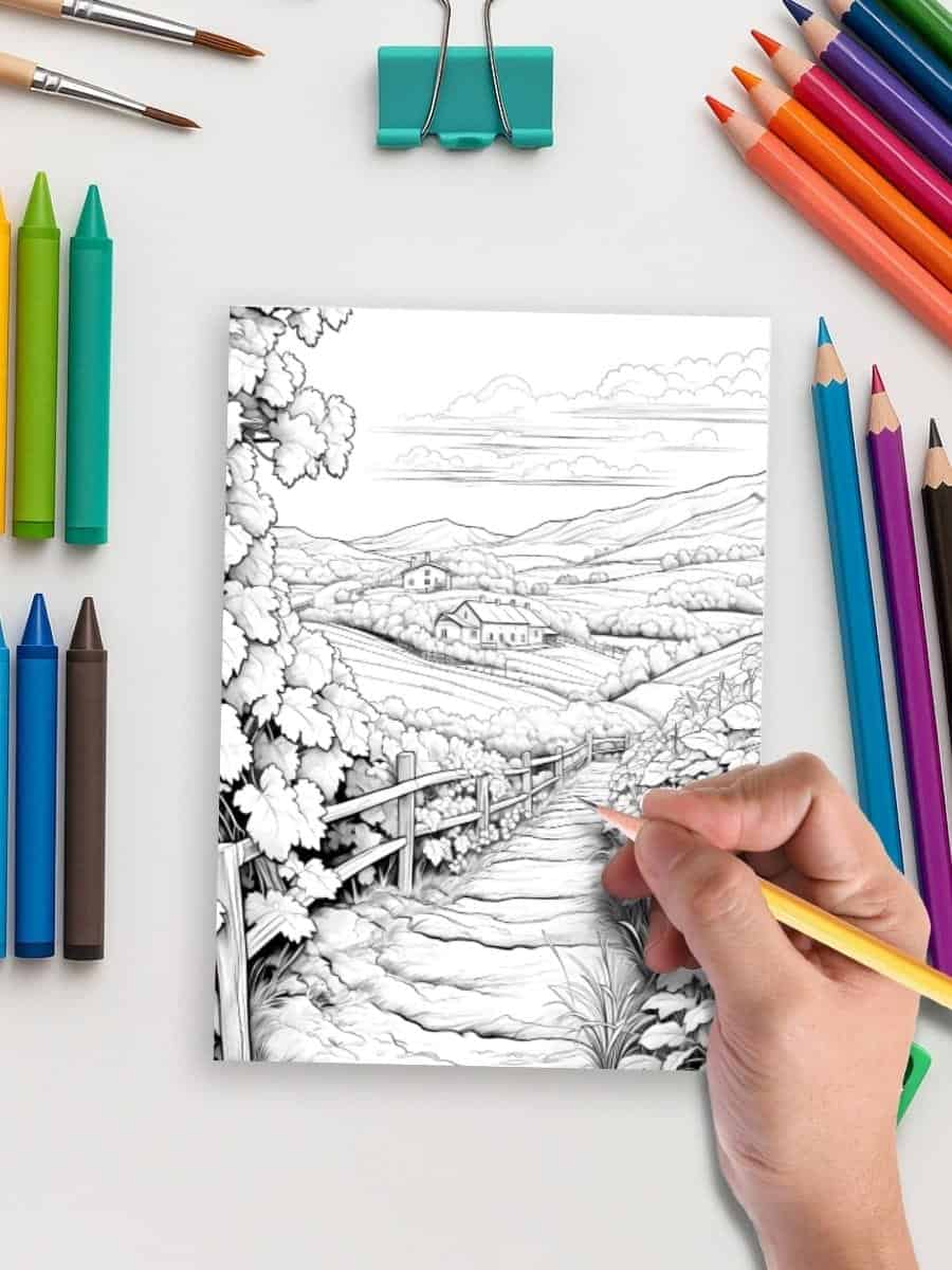 Enjoy a rustic country escape with 50 coloring pages filled with blooms, barns, fences, and cozy charm.