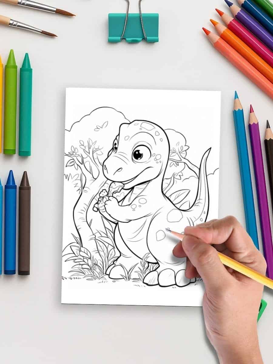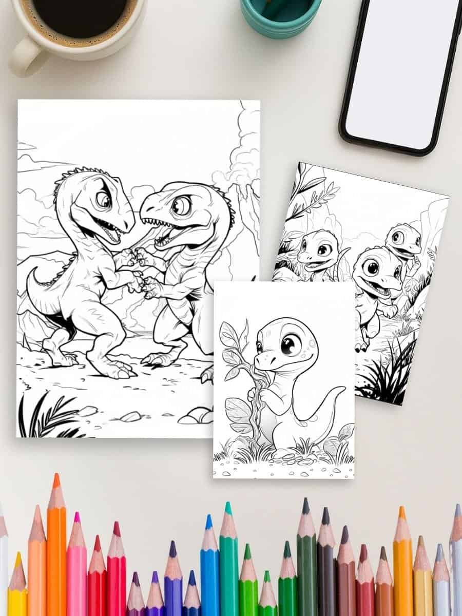 52 fun and adventurous dinosaur coloring pages filled with prehistoric scenery and friendly dinos.