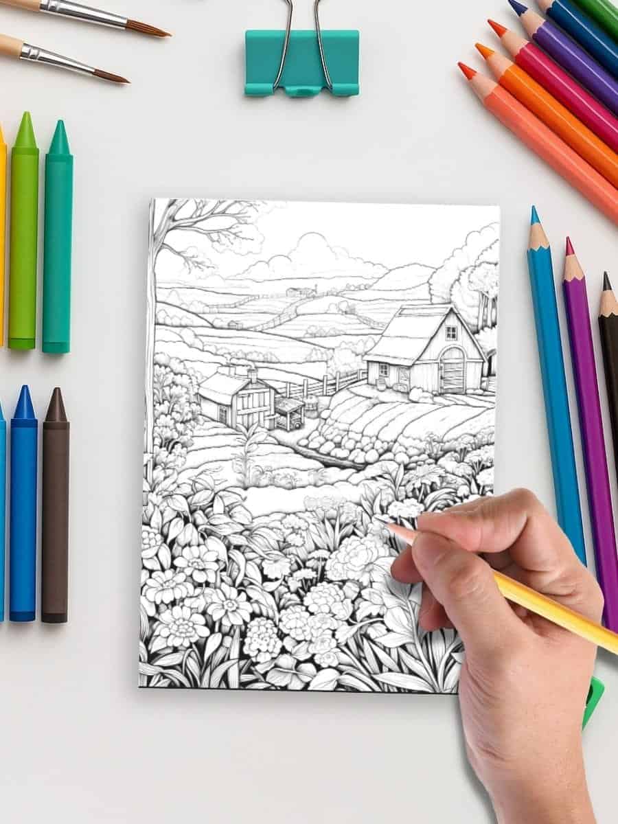 125 peaceful coloring pages inspired by farm gardens, homesteads, and country scenes.