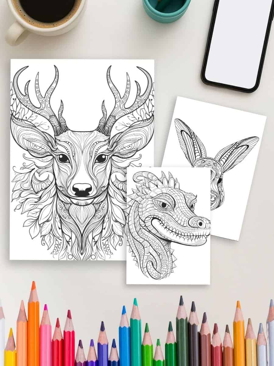 54 animal-themed coloring pages filled with intricate mandala-style patterns for mindful creativity.