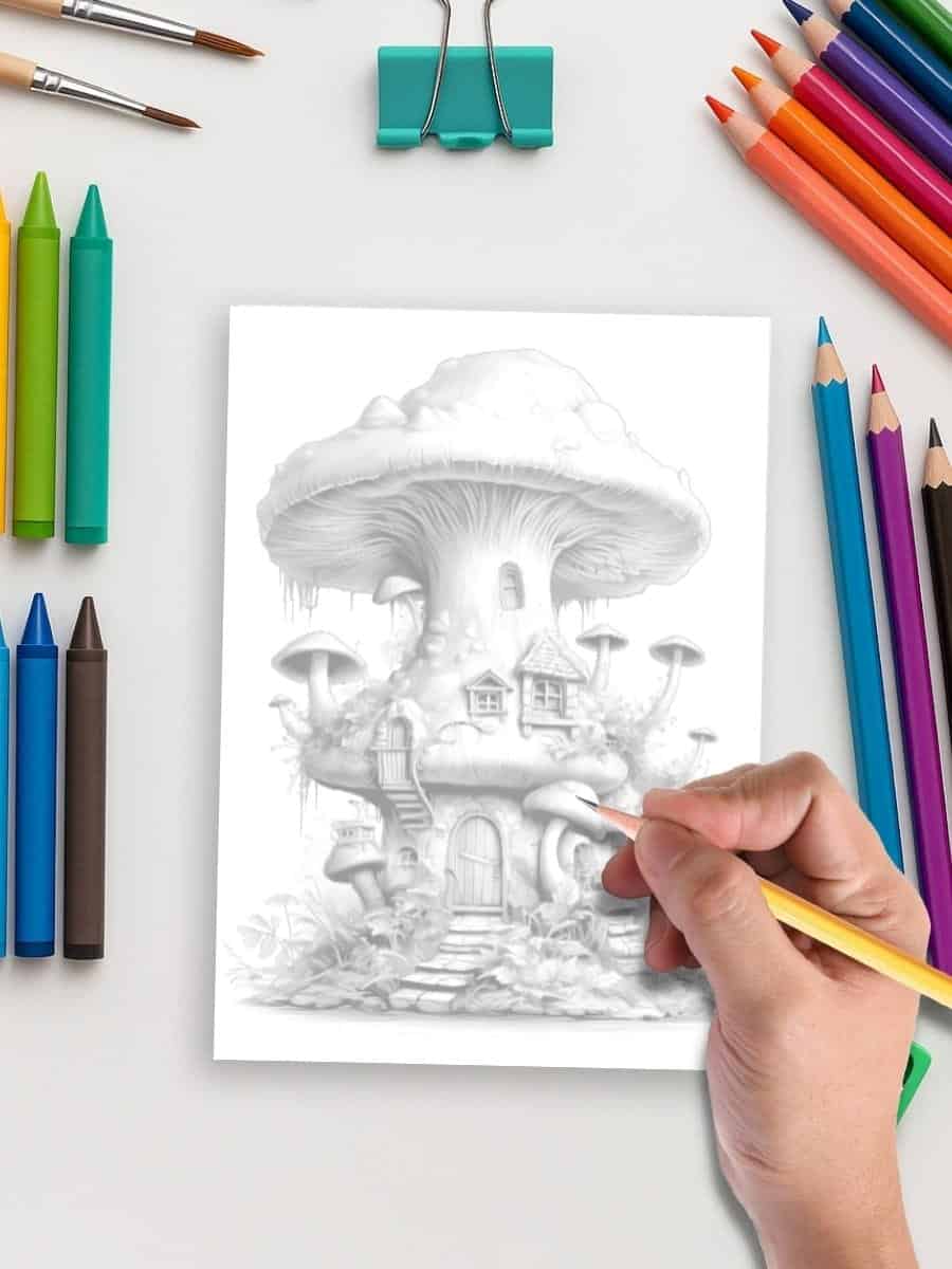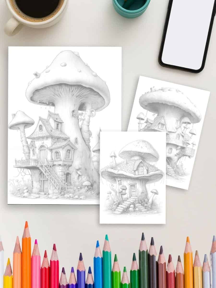 This charming collection features detailed mushroom cottages nestled in forest scenes. A relaxing and imaginative coloring experience.