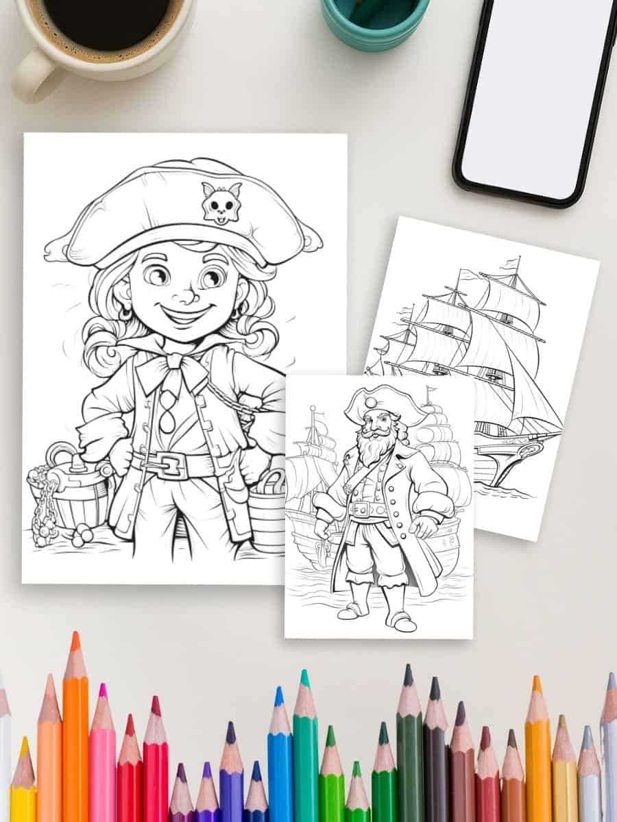 50 pirate-themed coloring pages featuring ships, treasure, sea monsters, and adventurous characters.