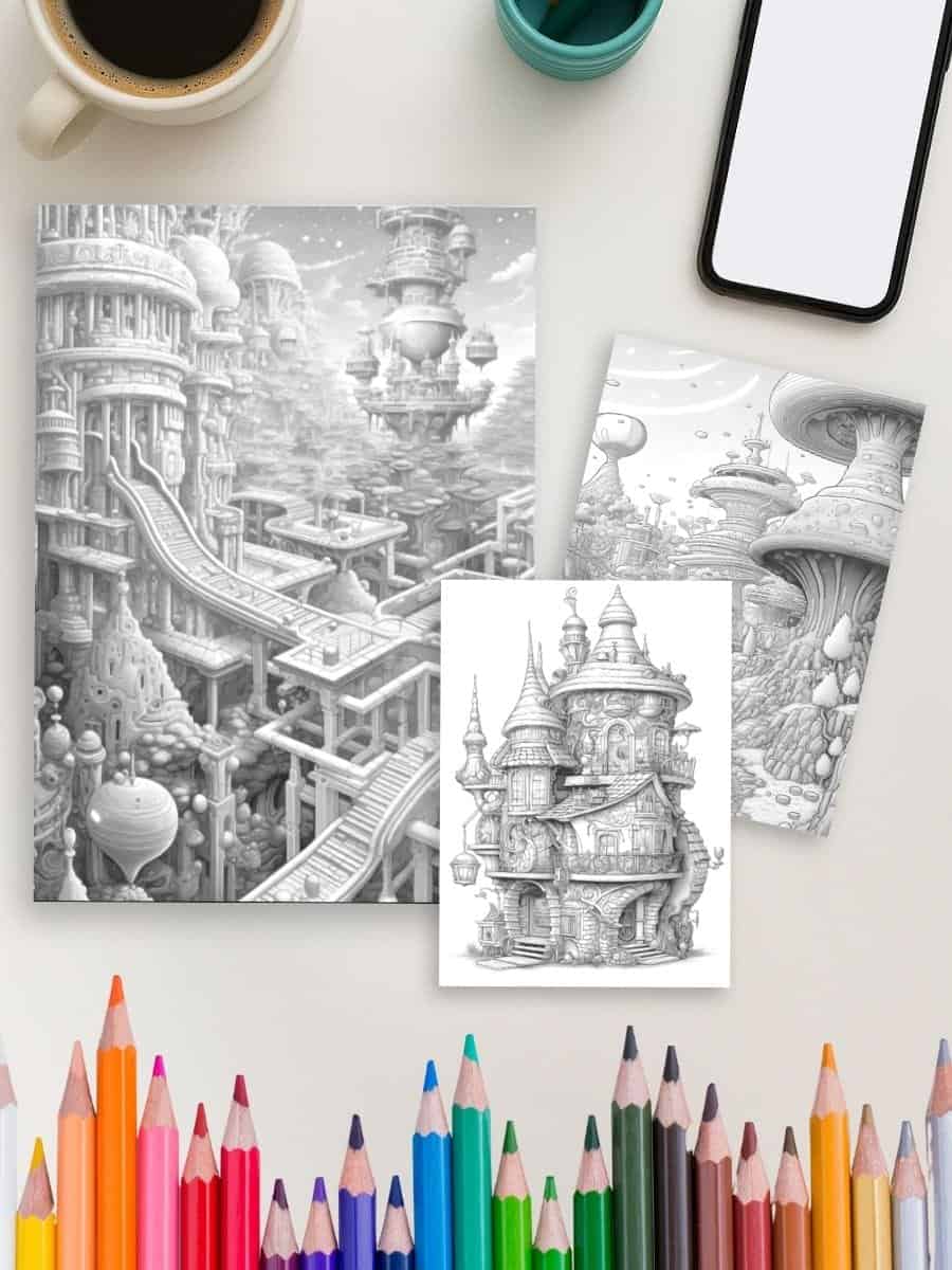 100 creative pages blending fairies with futuristic homes, gadgets, and glowing environments.