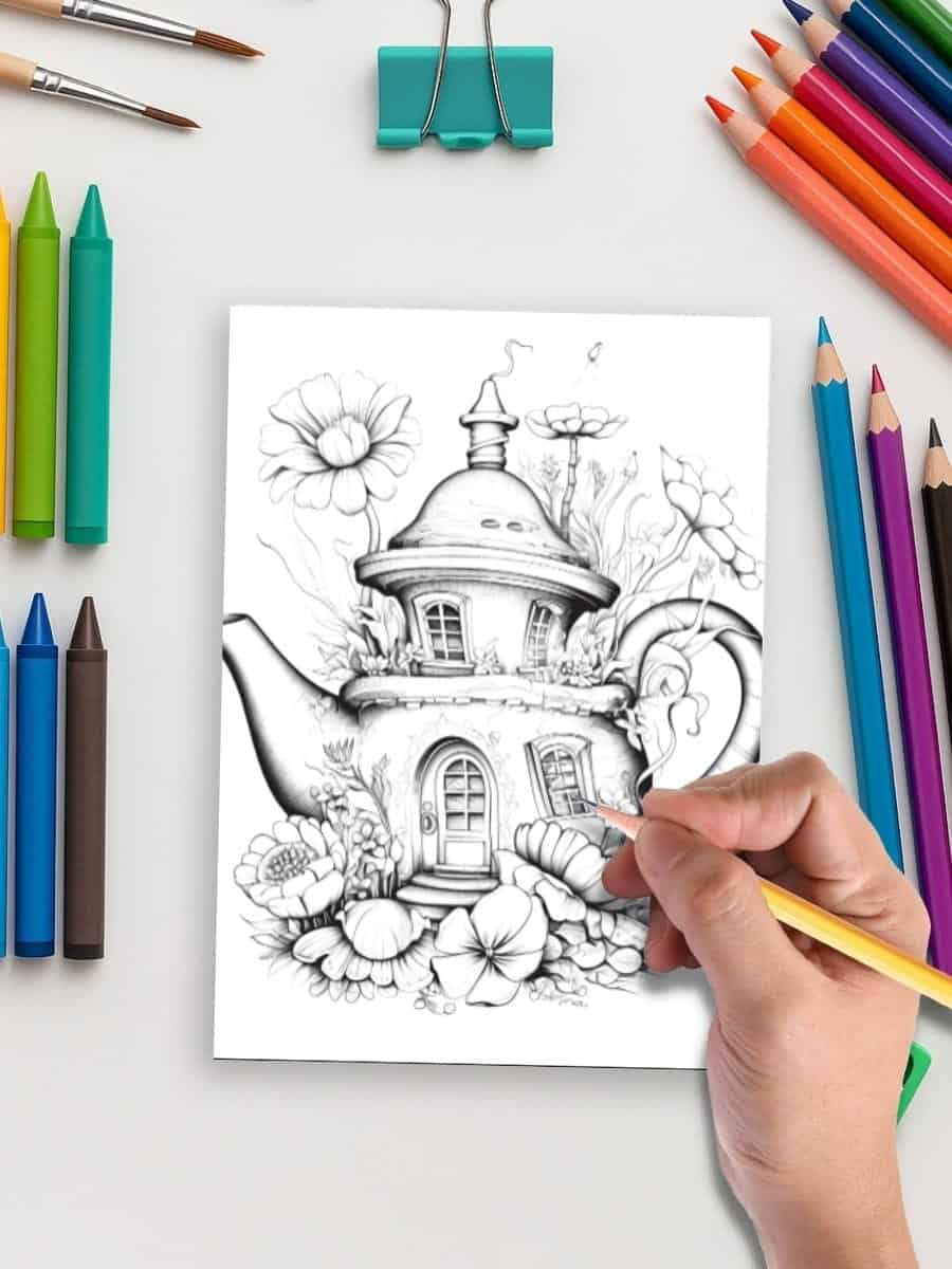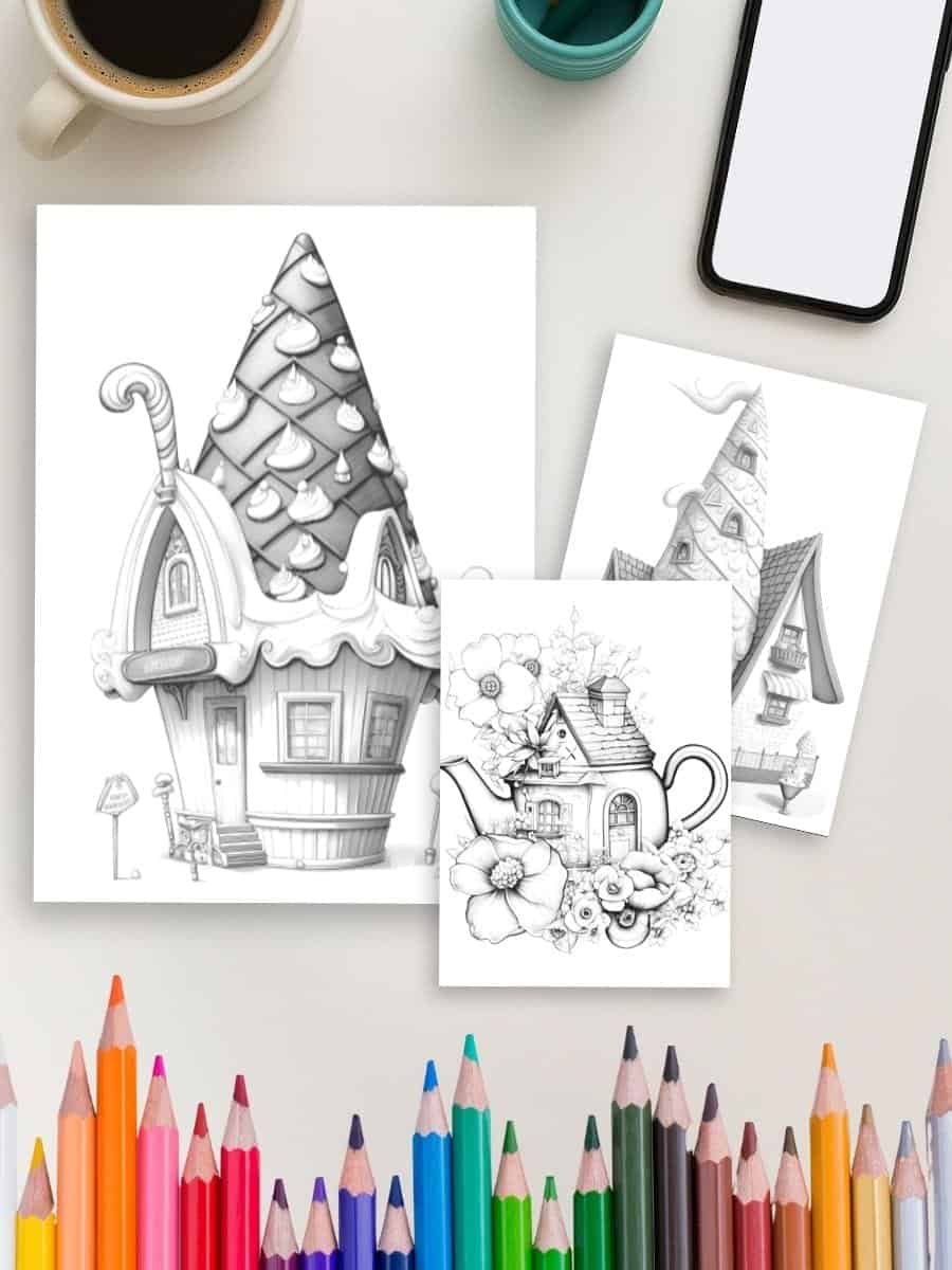 250 creative coloring pages featuring houses made of candy, cupcakes, fruits, and other delicious designs.